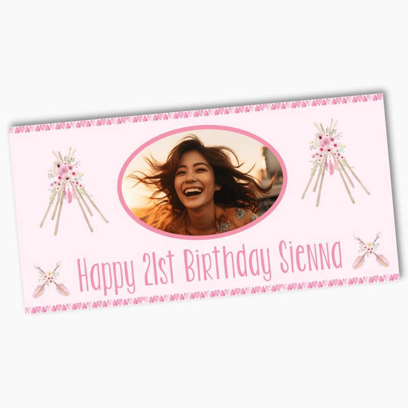 Create a stylish and boho-chic celebration with our Personalised Floral Boho Skull & Teepees Banners with Photo! Upload a photo of the guest of honor using our easy-to-use online editor and preview your custom design instantly.