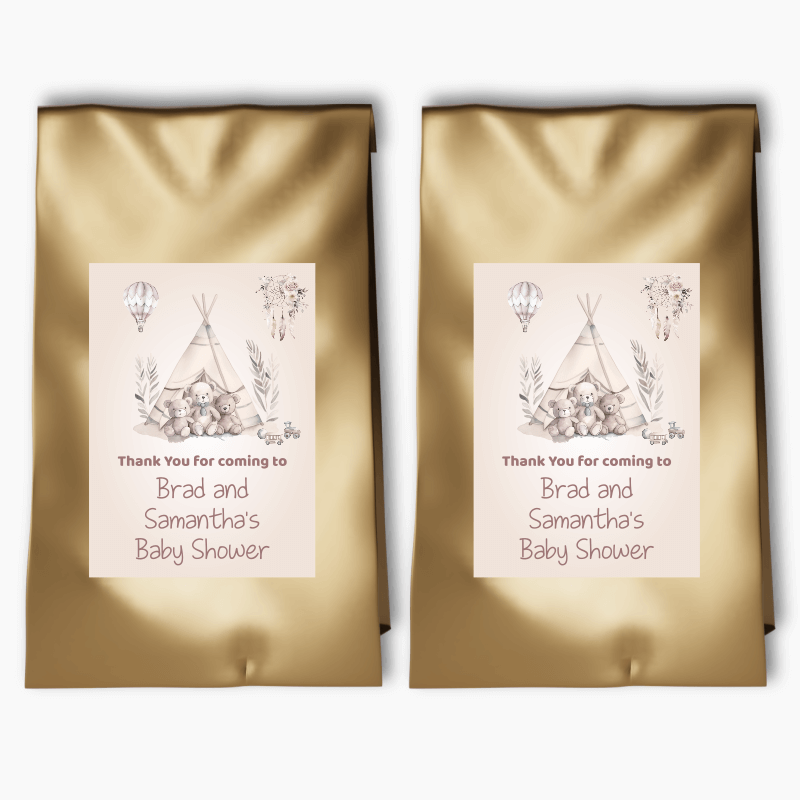 So why wait? Treat your guests to something special with our Personalised Boho Teddy Bears Baby Shower Party Bags & Labels. Just add some fun trinkets and lolly's and your party bags are sure to be a hit. Order now and make your next event one to remember!