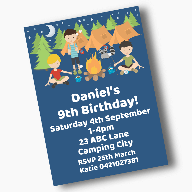 Are you looking for a way to make your party stand out from the rest? Look no further than our Personalised Boys Camp Out Birthday Party Invites! Our amazing invitations are designed to impress your guests from the moment they receive them.
