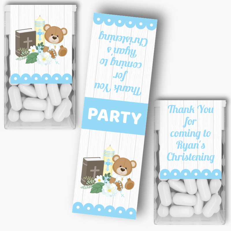 So why settle for boring Tic Tac containers when you can add your personal touch with our Personalised Boys Teddy Bear Christening Tic Tac Labels? Make your next celebration unforgettable with our fun and unique party favours. Order now and let the party begin!