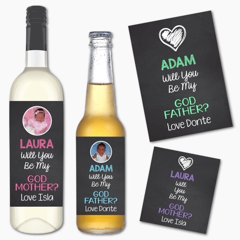 Each label can be personalised with the names of the Godparent and Godchild, making them not just gifts, but treasured keepsakes. Whether you're asking someone to be a Godfather or Godmother, these labels transform an ordinary bottle into a fun and unique gift idea.