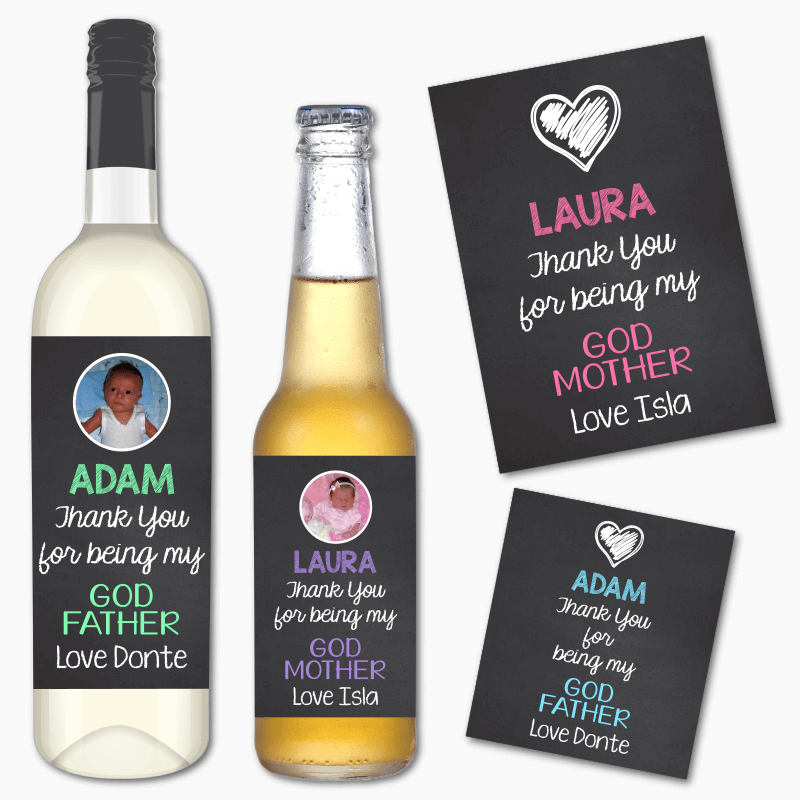 Express your heartfelt gratitude to your child's godparents with the delightful Chalk Thank You Godparent Wine & Beer Labels. These labels, adorned in four fantastic colors, offer a whimsical chalk design that conveys a sincere "Thank You for being my Godparent" message. Each label can be personalised with the names of both godparent and godchild, creating a fun and unique gift that stands out.