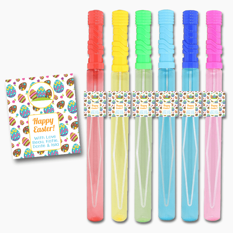 Looking for a fun and versatile way to add a personal touch to your party decorations? Look no further than our 'Colourful Eggs' Easter Gift Rectangle Stickers! These customised stickers are perfect for decorating drinks, favours, loot boxes, and even bubble wands!