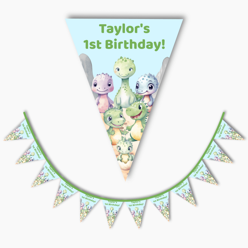 Are you tired of generic party decorations that lack personality? Look no further than our Personalised Cute Baby Dinosaurs Party Flag Bunting! Perfect for any occasion, our bunting is customisable with your choice of text and images. This is not your ordinary bunting decoration - it's a unique and customisable design that will make your special occasion stand out from the rest.