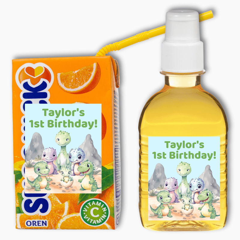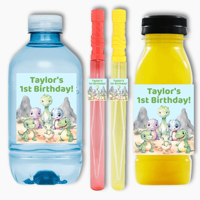 Looking for a fun and versatile way to add a personal touch to your party decorations? Look no further than our Personalised Cute Baby Dinosaurs Party Rectangle Stickers! These customised stickers are perfect for decorating drinks, favours, loot boxes, and even bubble wands!
