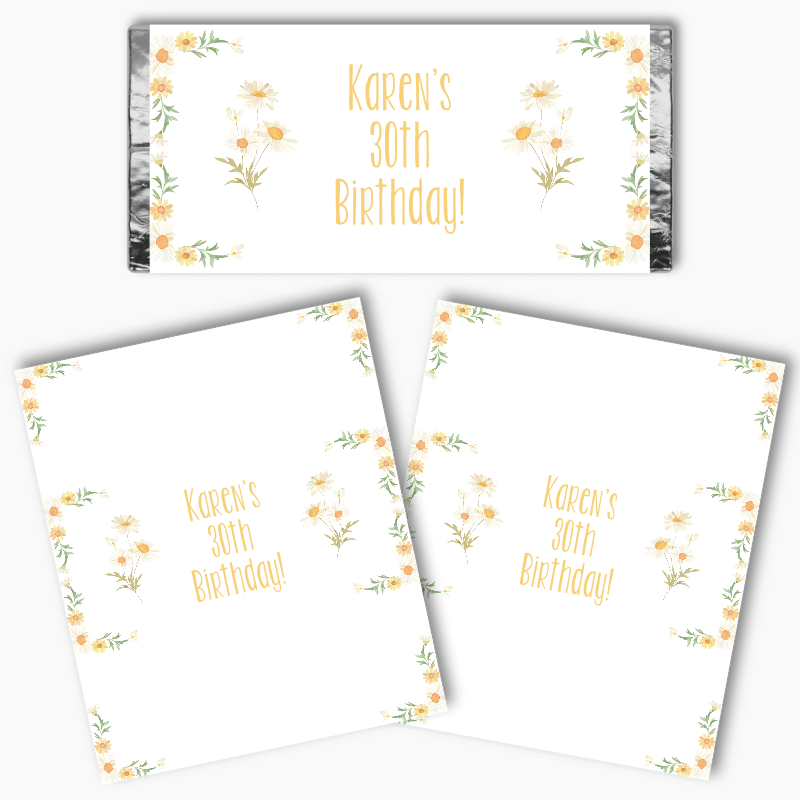 So why wait? Check out our helpful guide for tips on how to wrap your chocolate bars with our personalised labels or watch our video to see just how easy it is. Don't settle for boring, generic party favours. Make your next event unforgettable with our Personalised Daisy Party Mini Chocolate Labels!