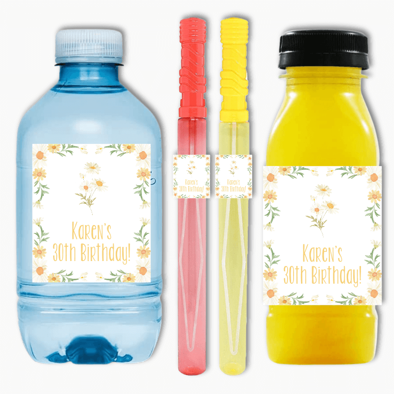 Looking for a fun and versatile way to add a personal touch to your party decorations? Look no further than our Personalised Daisy Party Rectangle Stickers! These customised stickers are perfect for decorating drinks, favours, loot boxes, and even bubble wands!