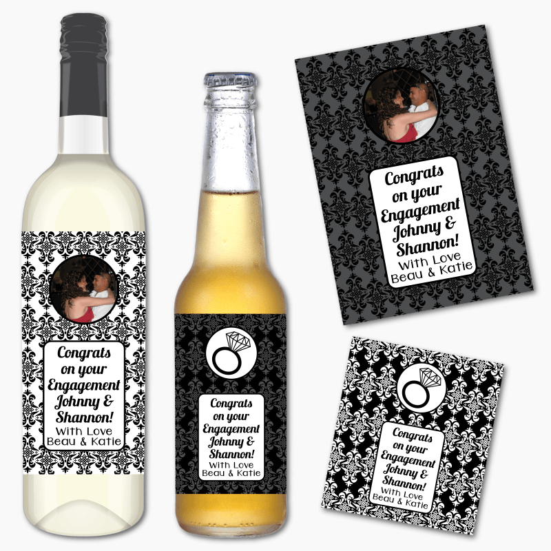 We understand the importance of timely delivery, and hence we offer fast shipping. We also offer Afterpay for added convenience. With our Elegant Damask Engagement Gift Wine & Beer Labels, make your gift the one they'll never forget.