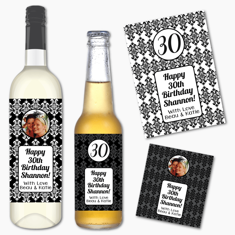 Introducing our Personalised Elegant Damask Birthday Gift Wine & Beer Labels, the perfect way to make your Birthday Gift truly unforgettable. With an elegant black and white damask design, these labels are guaranteed to add a touch of sophistication to any celebration.