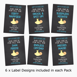 Our pack includes 6 exclusive designs, each representing a memorable milestone in a new dad's journey - Dirty Nappies, Endless Crying, 3am Feeds, Drool & Spit Up, Messes Made, and Sleepless Nights. Each label is a delightful reminder of the small and big moments that make fatherhood worthwhile.
