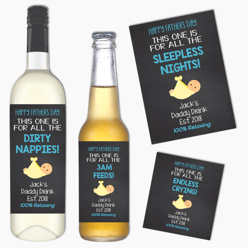 Give the new dad a gift that will bring a smile to his face every time he reaches for a bottle. With our New Dad Milestones Wine & Beer Labels, you are not just giving a gift, but sharing a moment of joy and laughter this Father's Day.
