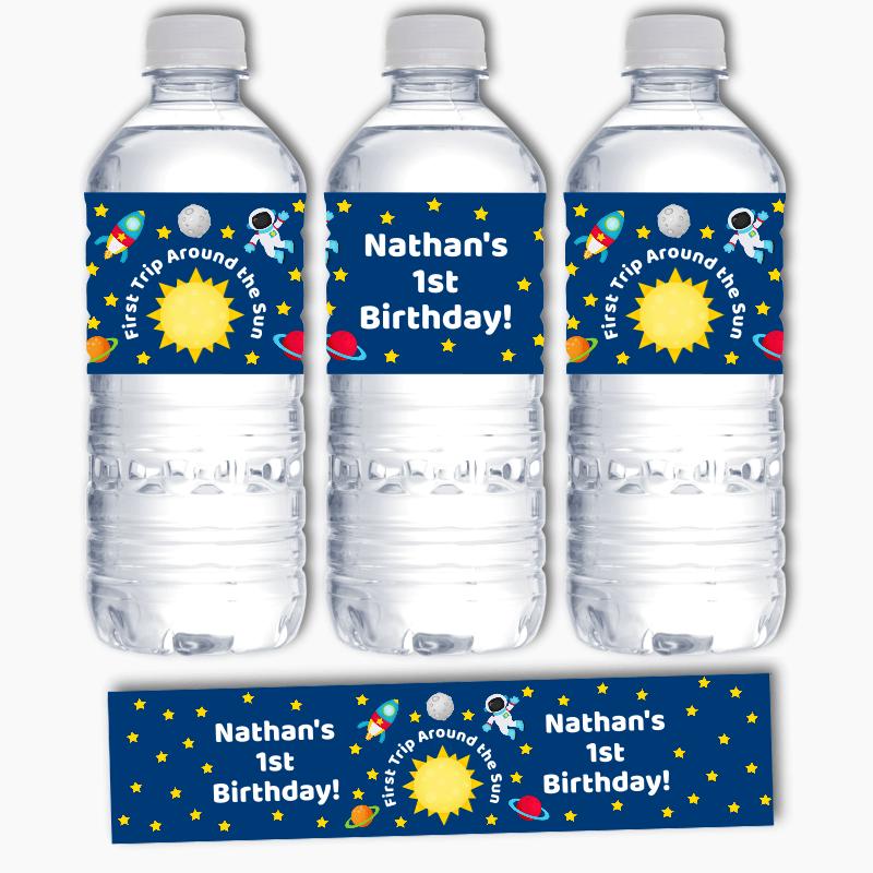 Are you looking to add a personal touch to your next party or special occasion? Look no further than our Personalised First Trip Around the Sun Party Water Bottle Labels! These unique labels are the perfect way to elevate your event and add a touch of style and sophistication to your party décor. We understand the importance of party styling, which is why our team of experts has designed these Water Labels for Parties to complement your theme and make your event unforgettable.