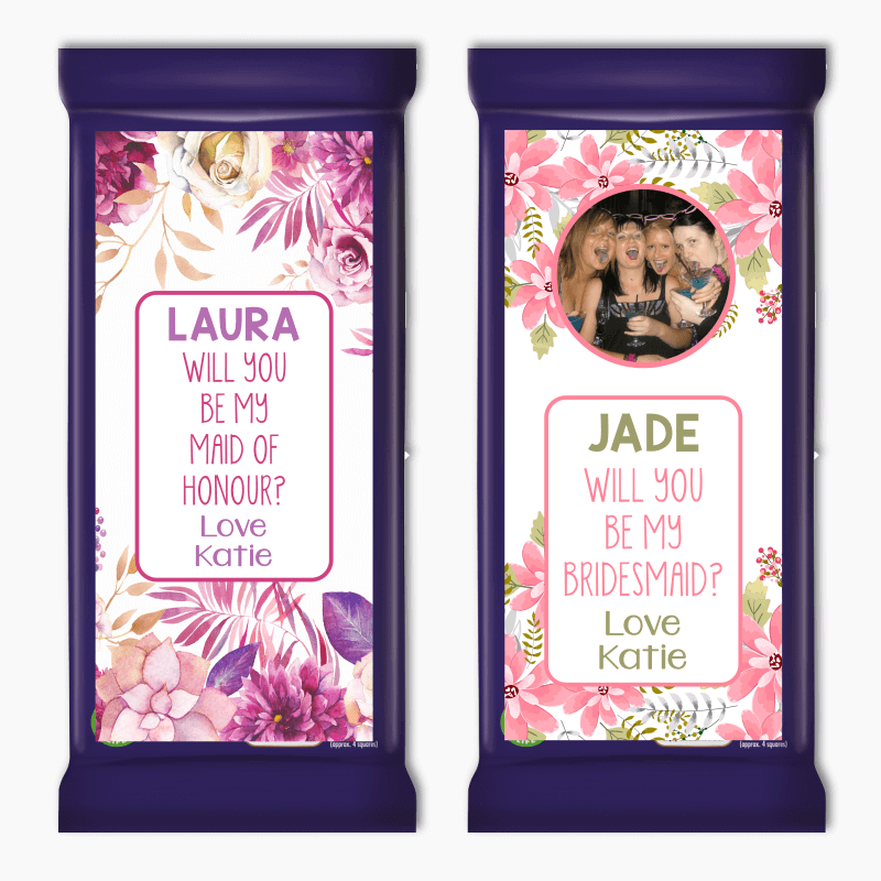 Introducing our delightful Floral "Will you be my Bridesmaid?" Cadbury Chocolate Labels, the perfect way to pop the question to your cherished friends. Each label is lovingly personalized with the recipient and sender's names, and even offers the option to upload a photo for an extra touch of sentimentality. With six stunning floral backgrounds to choose from, you can tailor these labels to match your wedding theme or your bridesmaids' individual styles, making each proposal as unique as your friendship.
