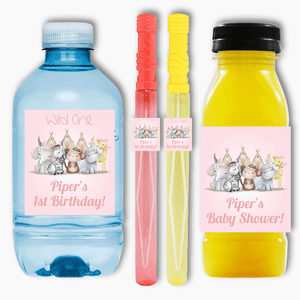 Looking for a fun and versatile way to add a personal touch to your party decorations? Look no further than our Personalised Girls Boho Jungle Animals Party Rectangle Stickers! These customised stickers are perfect for decorating drinks, favours, loot boxes, and even bubble wands!