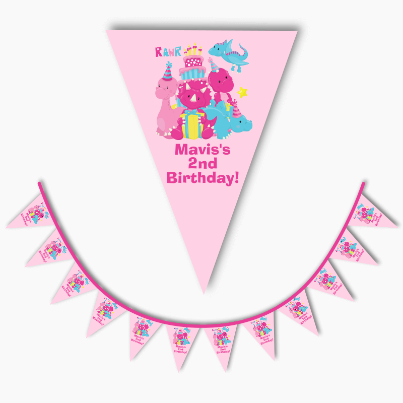 Personalised Little Girls Dinosaur Party Flag Bunting