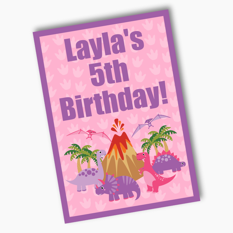 Check Out our Full Range of Personalized Girls Dinosaur Birthday Party Banners, Decorations & Labels. We also have Discounted Party Packs Available at Amazing Prices!