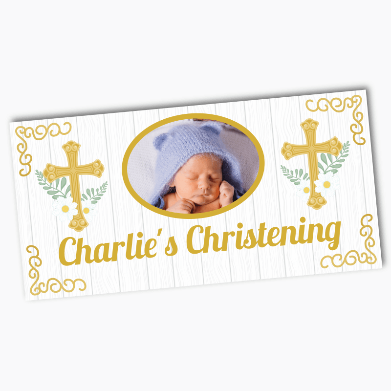 Celebrate a meaningful milestone with our Personalised Gold Cross Christening Banners with Photo — a beautiful and elegant way to honour your child’s special day. Simply upload a photo of your little one using our easy online editor and preview your design instantly.