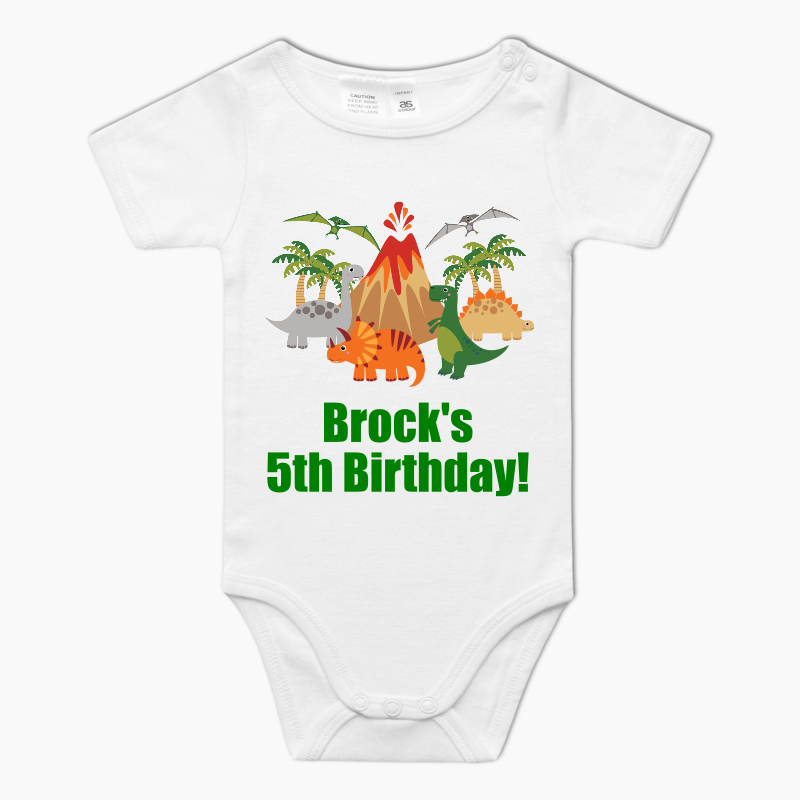 Celebrate your baby's special day with an outfit as unique as the occasion itself. Order your Custom Green Dinosaur Party Baby One-Piece Romper today and make your little one the star of the party.
