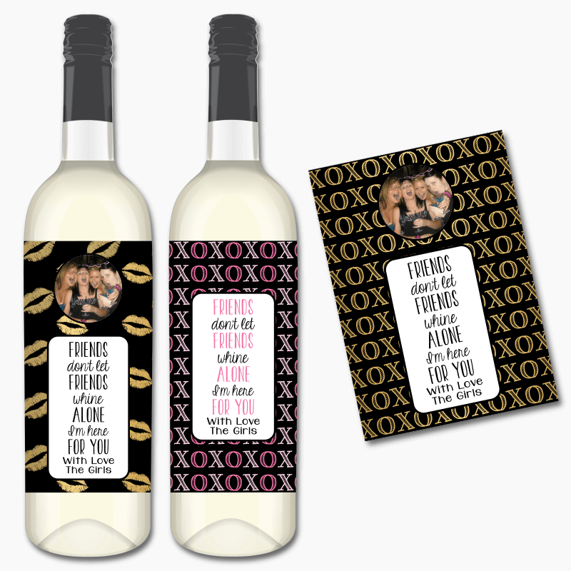Expect nothing less than professional print quality that captures every detail of your thoughtful design. And with fast shipping and Afterpay available, your gift can be ready and waiting to bring a smile to your friend's face whenever the moment calls for it. Elevate your gift-giving with our Personalised Hugs & Kisses 'Whine Alone' Gift Wine Labels and watch as that frown turns upside down!