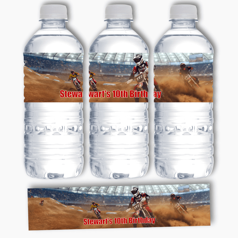 Are you looking to add a personal touch to your next party or special occasion? Look no further than our Personalised Motocross Party Water Labels! These unique labels are the perfect way to elevate your event and add a touch of style and sophistication to your party décor. We understand the importance of party styling, which is why our team of experts has designed these Water Labels for Parties to complement your theme and make your event unforgettable.