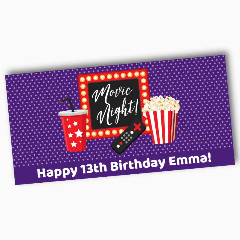 Check Out our Full Range of Personalized Purple Movie Night Birthday Party Banners, Decorations & Labels. We also have Discounted Party Packs Available at Amazing Prices!