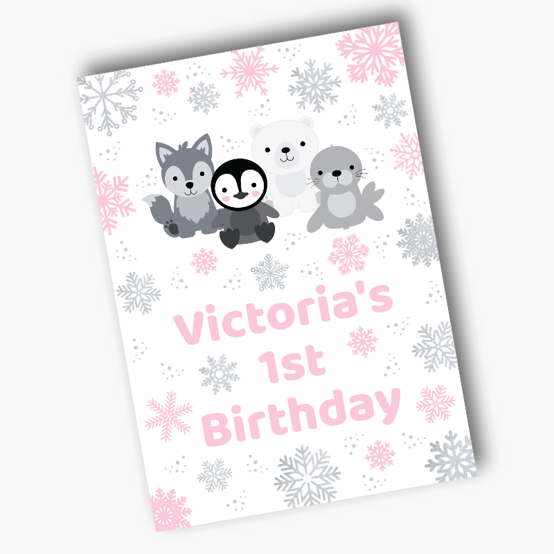 Check Out our Full Range of Personalized Pink & Silver Arctic Animals Birthday Party Banners, Decorations & Labels. We also have Discounted Party Packs Available at Amazing Prices!
