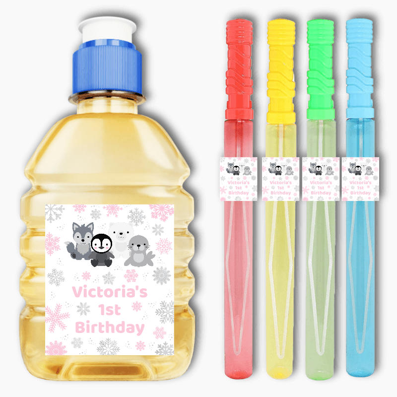 Looking for a fun and versatile way to add a personal touch to your party decorations? Look no further than our Personalised Pink & Silver Arctic Animals Birthday Party Rectangle Stickers! These customised stickers are perfect for decorating drinks, favours, loot boxes, and even bubble wands!