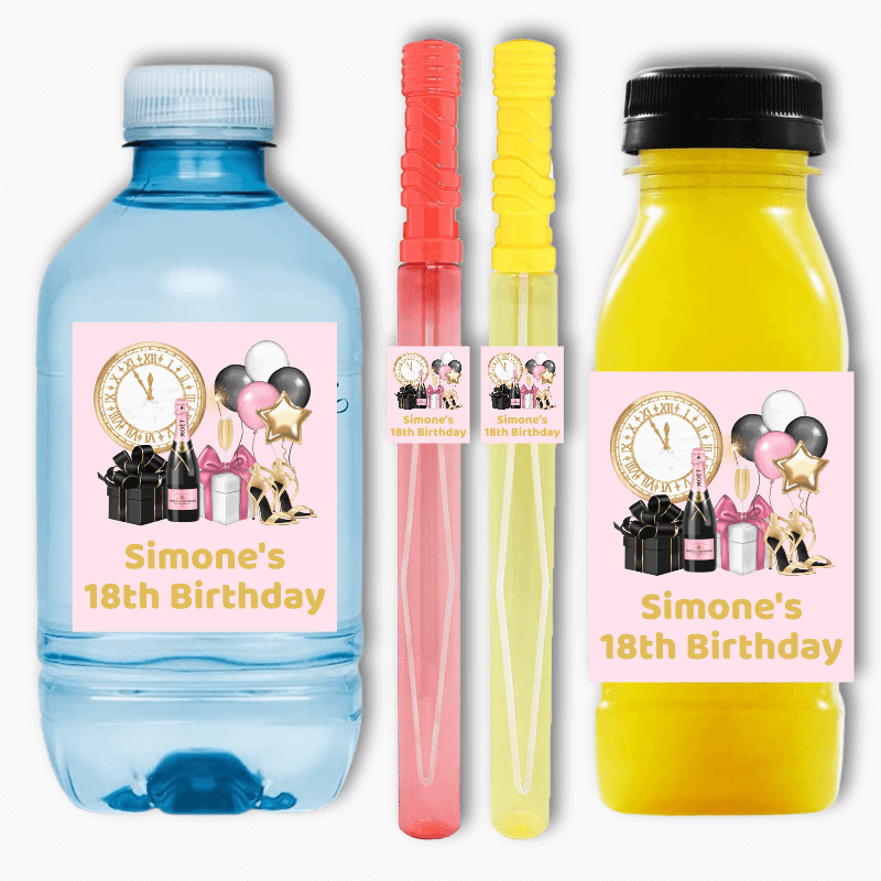 Looking for a fun and versatile way to add a personal touch to your party decorations? Look no further than our Personalised Pink, Black & Gold Party Rectangle Stickers! These customised stickers are perfect for decorating drinks, favours, loot boxes, and even bubble wands!