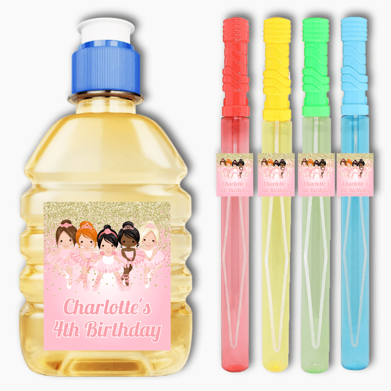 Looking for a fun and versatile way to add a personal touch to your party decorations? Look no further than our Personalised Pink & Gold Ballerinas Birthday Party Rectangle Stickers! These customised stickers are perfect for decorating drinks, favours, loot boxes, and even bubble wands!