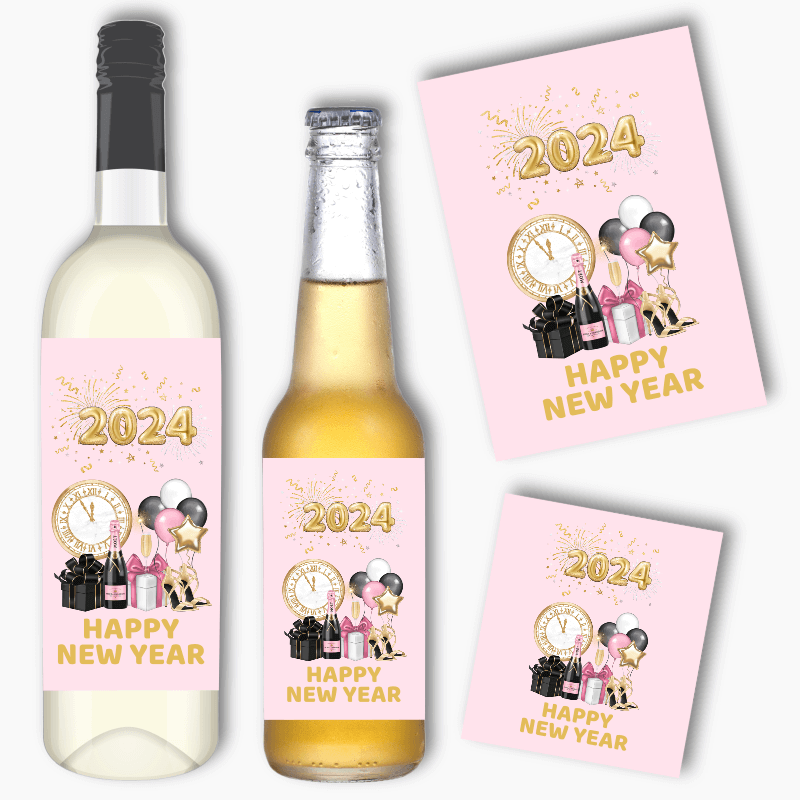 The labels flaunt a soft pink background, complemented by a striking blend of pink, black, and gold foil accents. They feature beautifully illustrated clipart images of balloons, champagne bottles, a countdown clock, gifts, and even sophisticated stilettos, adding an air of festive sophistication to your celebrations.