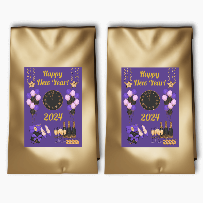 These bags boast a visually pleasing design - a stunning purple background adorned with gold glitter and black charcoal accents. They feature festive clipart images of champagne, balloons, and a countdown clock, adding a vibrant holiday spirit to your New Year's Eve party.