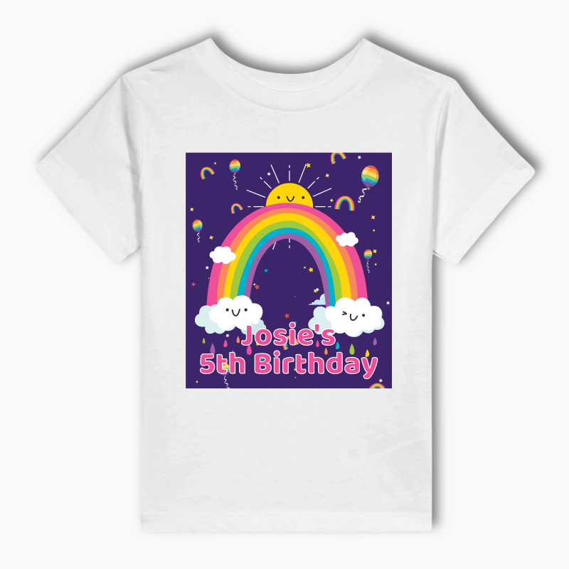 Not only do these t-shirts serve as a perfect party wear, but they also add a stylish and comfortable piece to your child's everyday wardrobe. Make your child's party unforgettable with a custom outfit that's as unique as your celebration, and order your Personalised Rainbow Party Kids T-Shirt today.