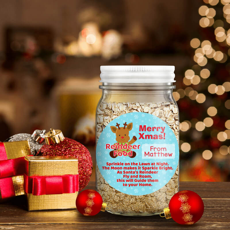 Our Reindeer Food labels are incredibly easy to use. All you have to do is peel and stick them onto Mini Mason Jars, Zip Lock bags, or Brown Kraft Paper Bags, then fill with a sparkly oat and glitter mixture. This "Reindeer Food" is inspired by a traditional Christmas activity, where children leave out food for Santa's reindeer on Christmas Eve.