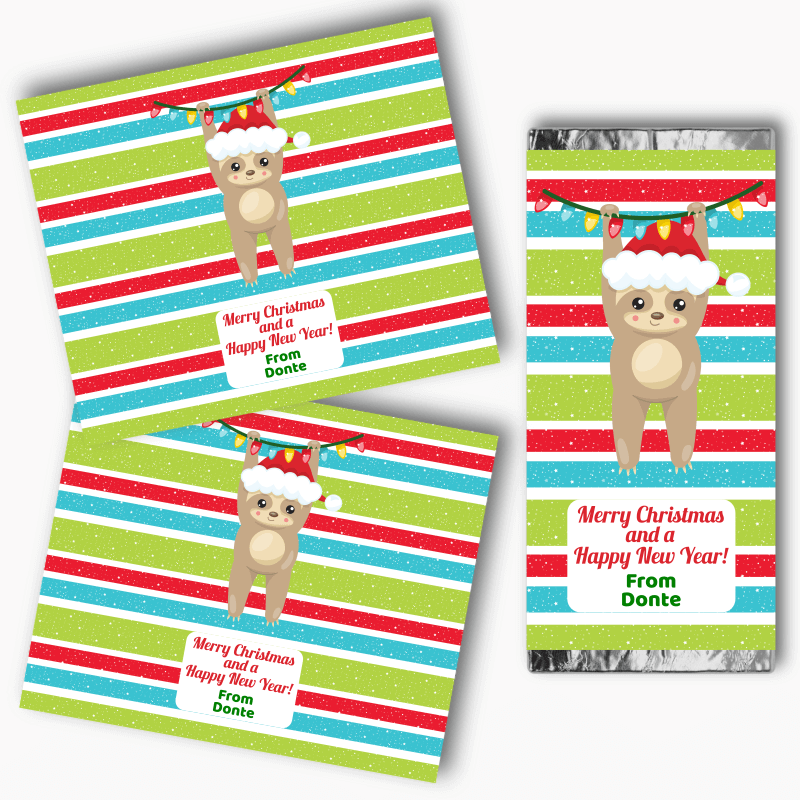 Experience the joy of gifting uniquely this holiday season with our adorable Sloth Christmas Gift Mini Chocolate Labels. These personalized labels, custom printed with the sender's name, are the perfect solution for those 'hard to buy for' family, friends, and coworkers. They also make fantastic Secret Santa and kids' school classmate gifts, taking the guesswork out of kids Christmas gifts!