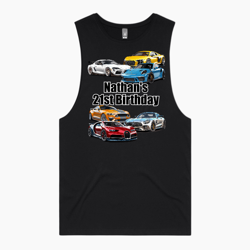 Elevate your celebration style with our Custom Sports Cars Birthday Party Men's Singlet Top, uniquely designed to add a personalised flair to your festivities. This men's singlet top is the ultimate selection for incorporating a bespoke touch that seamlessly matches your party theme, turning it into a key piece for any joyous occasion.