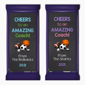 The Cheers Sports Coach Gift Cadbury Chocolate Labels are the perfect way to show your appreciation for your child's sports coach. These customisable labels offer a unique and thoughtful way to transform an ordinary Cadbury chocolate bar into a personalised gift and keepsake. With the option to custom print the sender's name via our intuitive online editor, you can create a one-of-a-kind present that stands out from the rest. Plus, you can preview your label as you design it, ensuring it's picture-perfect before you place your order.