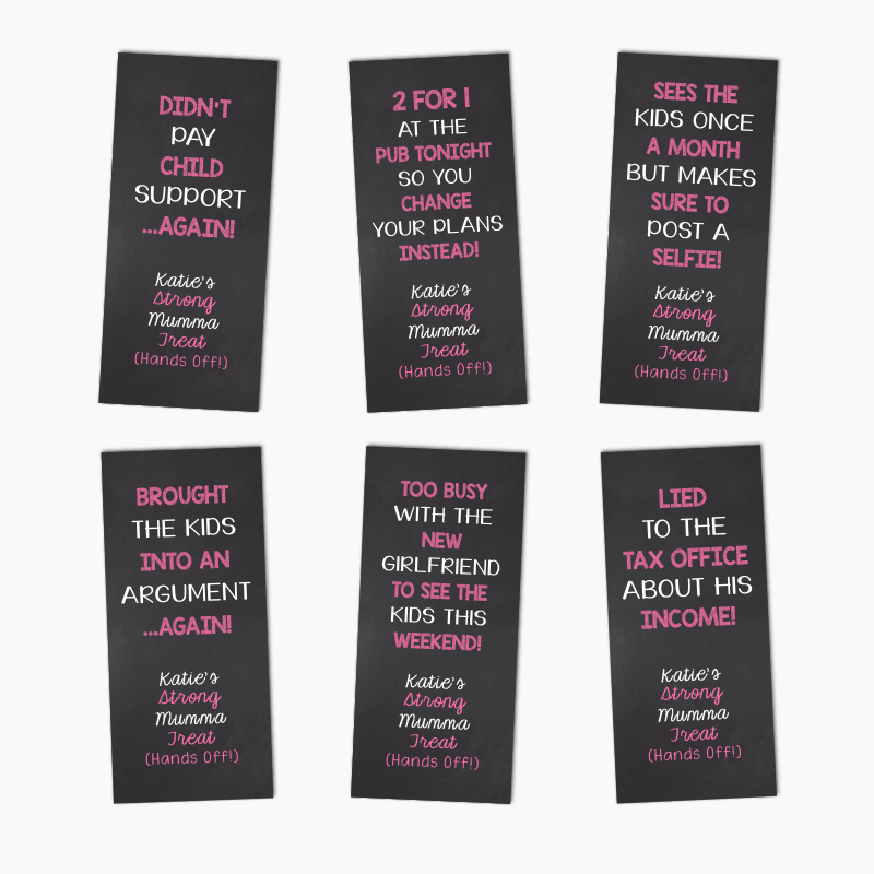 Celebrate the resilience and strength of the incredible single mother in your life with a gift that combines humor, support, and sweetness. Our Strong Single Mumma Treat Gift Cadbury Chocolate Labels are the perfect way to show your love and solidarity for a mum navigating the challenges of solo parenting. Whether she's dealing with the aftermath of a separation, a rough patch, or the daily trials that come with being a single parent, these labels offer a light-hearted touch to lift her spirits.