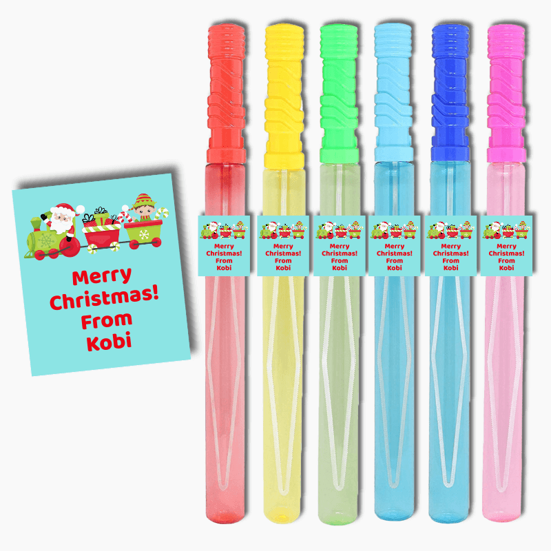 Looking for a fun and versatile way to add a personal touch to your party decorations? Look no further than our Santa Train Christmas Gift Rectangle Stickers! These customised stickers are perfect for decorating drinks, favours, loot boxes, and even bubble wands!