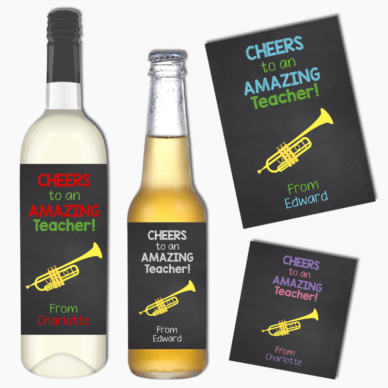 Express your gratitude to your child's music teacher in a unique way with our Trumpet Music Teacher Gift Wine & Beer Labels. These custom-made, trumpet-themed labels are not just presents for a trumpet teacher, they are a charming keepsake, a tender memento of your child's musical journey. These labels, personalisable with the sender's name, elevate any wine or beer bottle into a thoughtful gift.