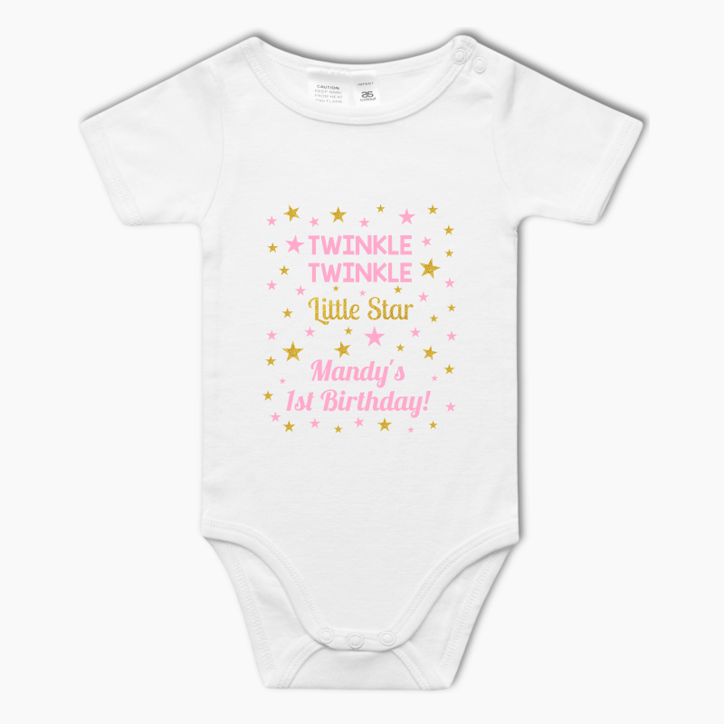 Celebrate your baby's special day with an outfit as unique as the occasion itself. Order your Personalised Twinkle Twinkle Little Star Baby One-Piece Romper today and make your little one the star of the party.