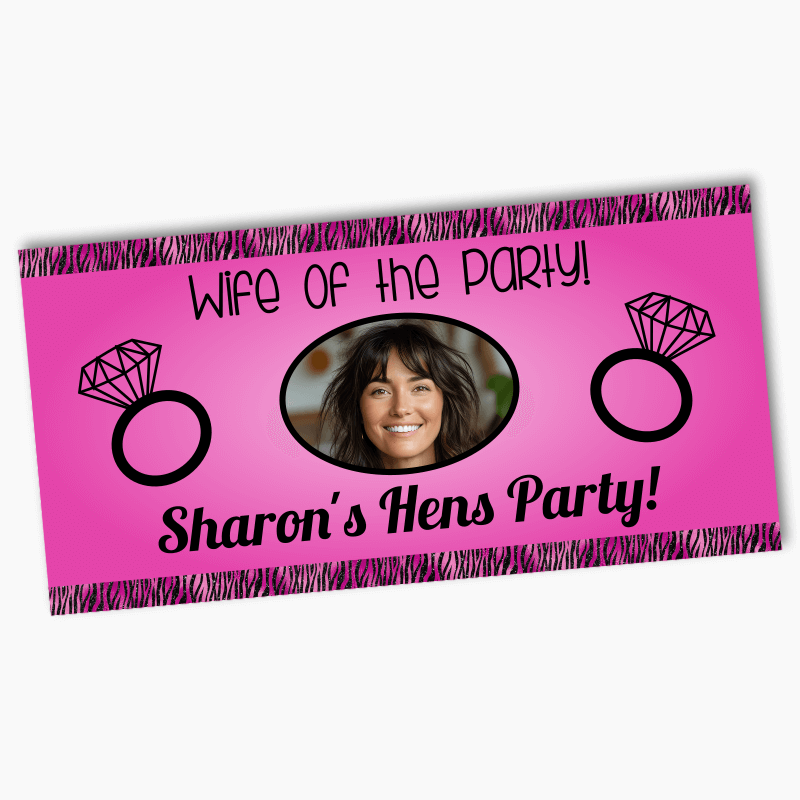 Celebrate in style with our Personalised 'Wife of the Party' Hens Party Banners with Photo! Perfect for hen’s nights and bridal events, these cheeky, custom photo banners feature bold “Wife of the Party” text alongside a black wedding ring icon on a vibrant fuchsia pink background with stylish pink leopard-print edges by DigitalCurio. The sleek black cursive font pops against the bright background, adding a touch of sass to your celebration.